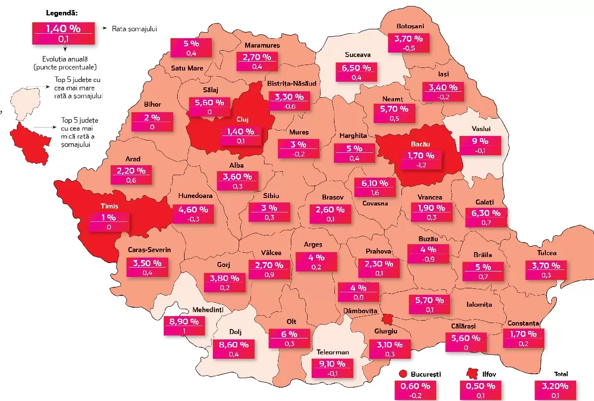 Rata şomajului diferă puternic între judeţele României, iar datele recente confirmă o polarizare tot mai pronunţată. În timp ce zone precum Teleorman, Vaslui, Mehedinţi sau Dolj se confruntă cu şomaj în jur de 9%, judeţe precum Timiş, Ilfov şi Bucureşti au valori de aproximativ 1%. Diferenţele sunt legate de structura economiei locale, investiţii, nivelul industrializării şi dependenţa de un număr redus de angajatori mari. În multe judeţe din sud şi est, lipsa investiţiilor noi menţine cercul plecărilor în străinătate, al salariilor reduse şi al şomajului persistent.