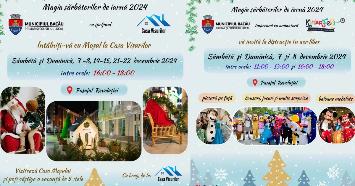 Primăria Bacău invită copiii și părinții să se bucure de activități în Pasajul Revoluției, în următoarele două weekend-uri. Animatorii pregătesc momente speciale, iar la Căsuța lui Moș Crăciun bradul strălucește, gata să întâmpine cei mici.