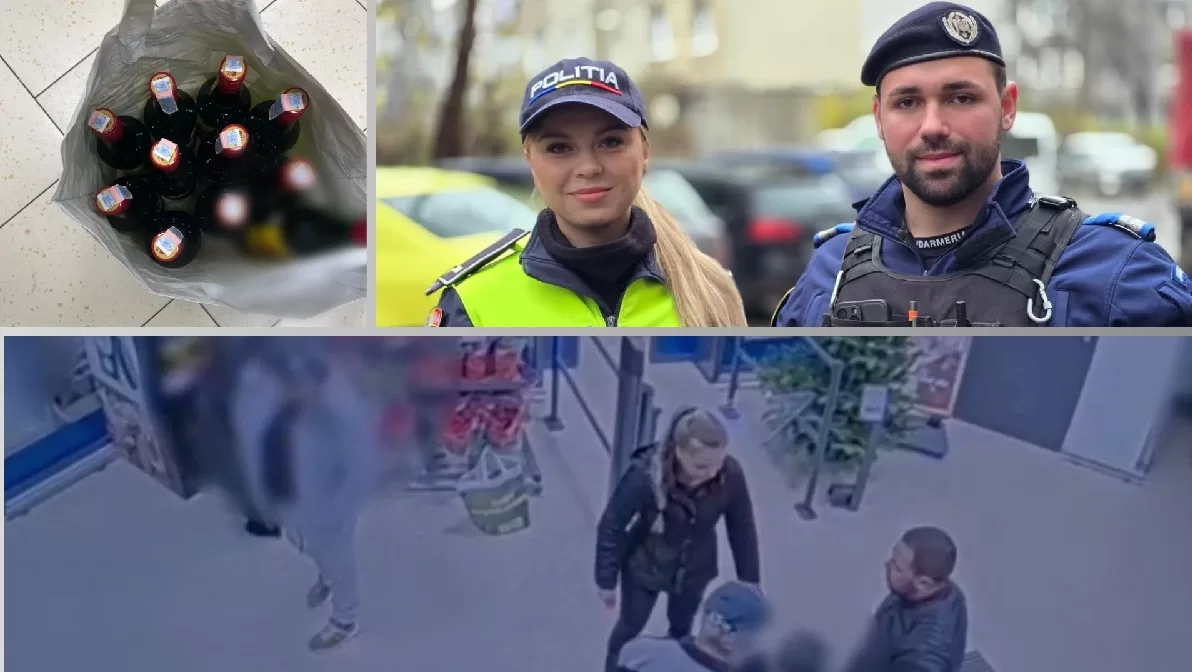 Un bărbat ar fi încercat să iasă dintr-un magazin cu 11 sticle de băuturi alcoolice, fără să le plătească, dar a fost oprit de un jandarm și o polițistă aflați în timpul liber, la cumpărături.