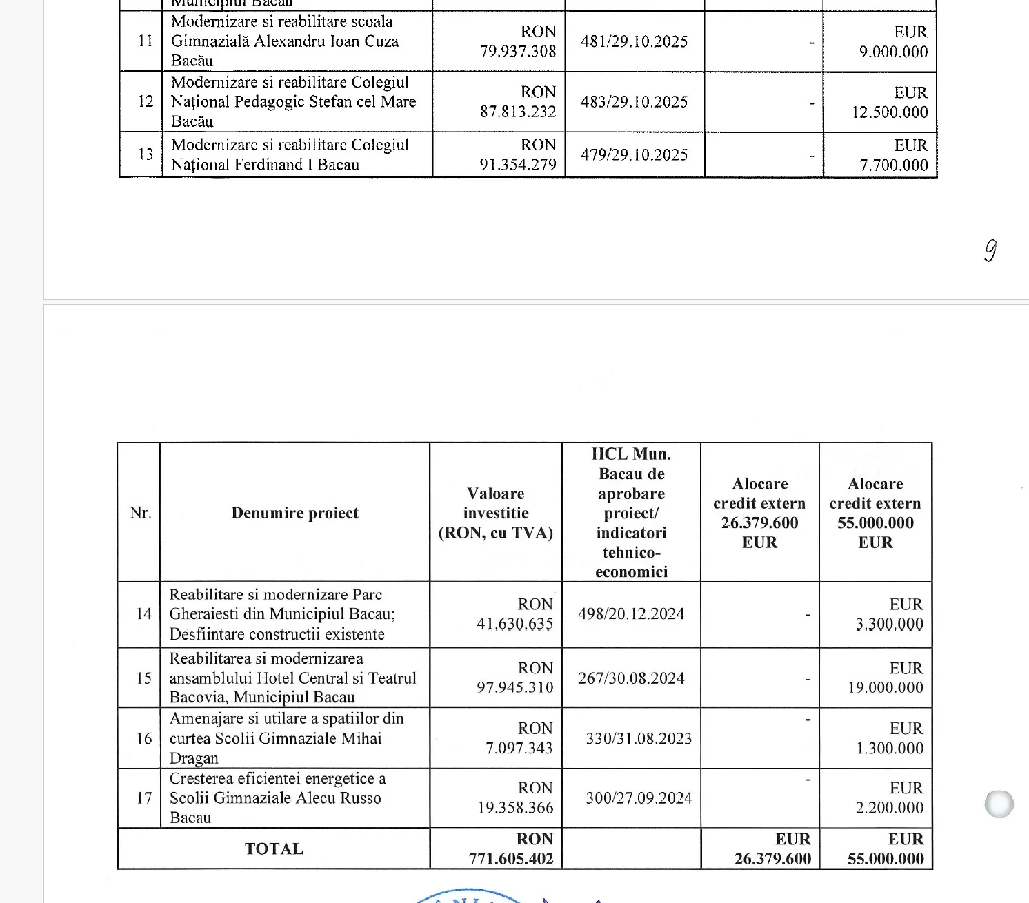 Primăria Bacău propune modificarea Hotărârii Consiliului Local nr. 179 din 8 mai 2023, în sensul majorării plafonului creditului extern ce poate fi contractat de municipiu. Potrivit proiectului de hotărâre, valoarea maximă a creditului extern ar urma să crească de la 26.379.600 euro la 81.379.600 euro, ceea ce înseamnă un credit suplimentar de până la 55 de milioane de euro, ce ar urma să fie contractat de la Banca de Dezvoltare a Consiliului Europei (BDCE).