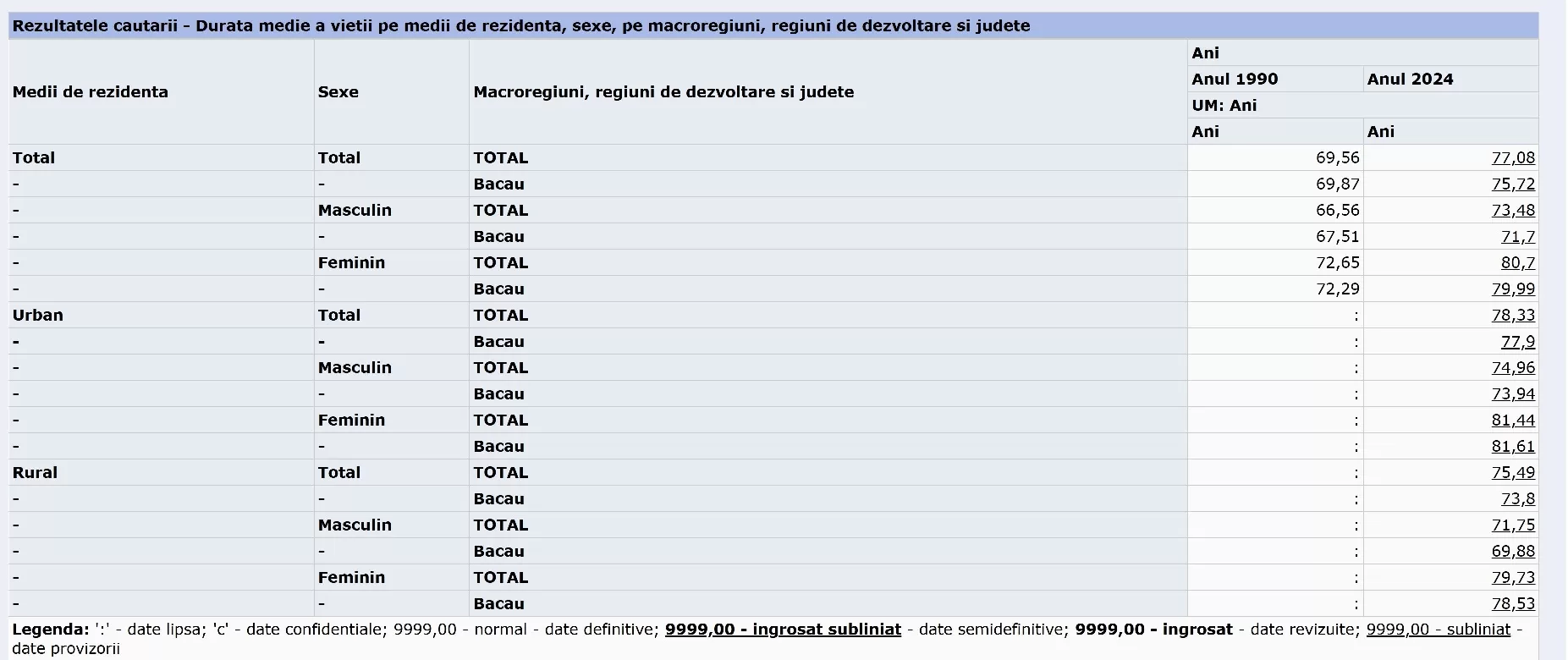 Speranța de viață în județul Bacău a urcat constant în ultimii 34 de ani, arată datele statistice oficiale. În 1990, un băcăuan trăia în medie 69,87 ani. În 2024, durata medie de viață a ajuns la 75,72 ani, ceea ce înseamnă un câștig de aproape șase ani. Evoluția este vizibilă la ambele sexe, însă diferențele se mențin: bărbații au o speranță de viață de 73,48 ani, în timp ce femeile ating 80,7 ani.